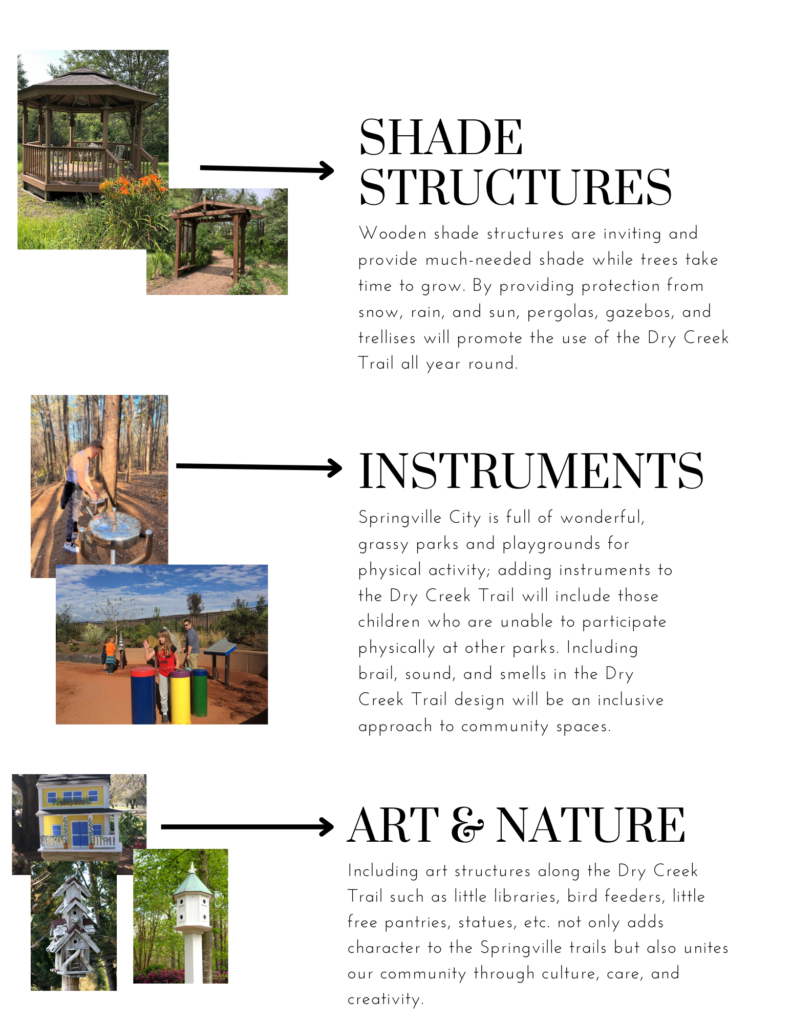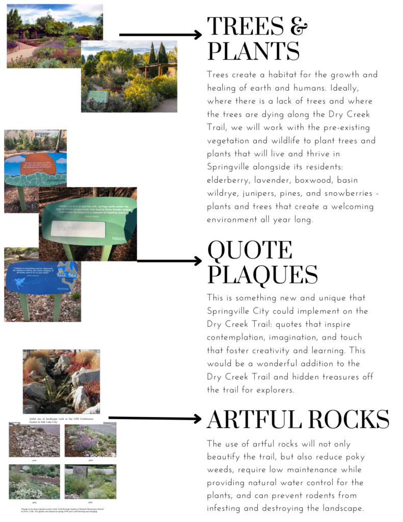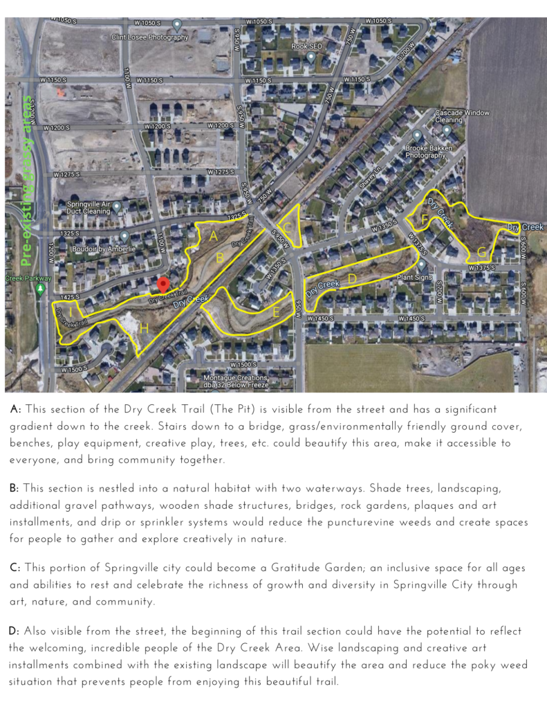 Our Dry Creek Trail located on the southwest side of Springville City has the potential to become a space that captures the beauty of the incredible, welcoming, and kind people in the Dry Creek Area – something that will last long after we are gone; a space for generations of Springvillians to feel gratitude and belonging. An inclusive place to reflect and enjoy native plants and flowers, shade, pathways to explore, hidden treasures to discover, inspirational quotes, and beautiful spaces all year round to unify our community from years of isolation. We believe that nature has a magical way of healing us.