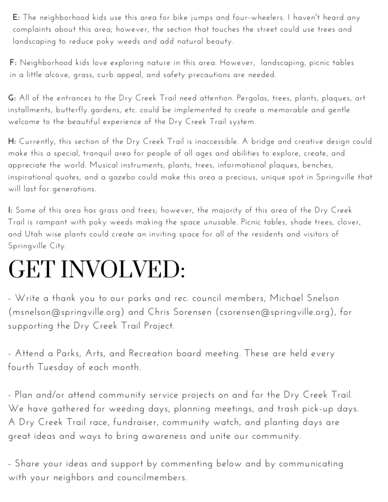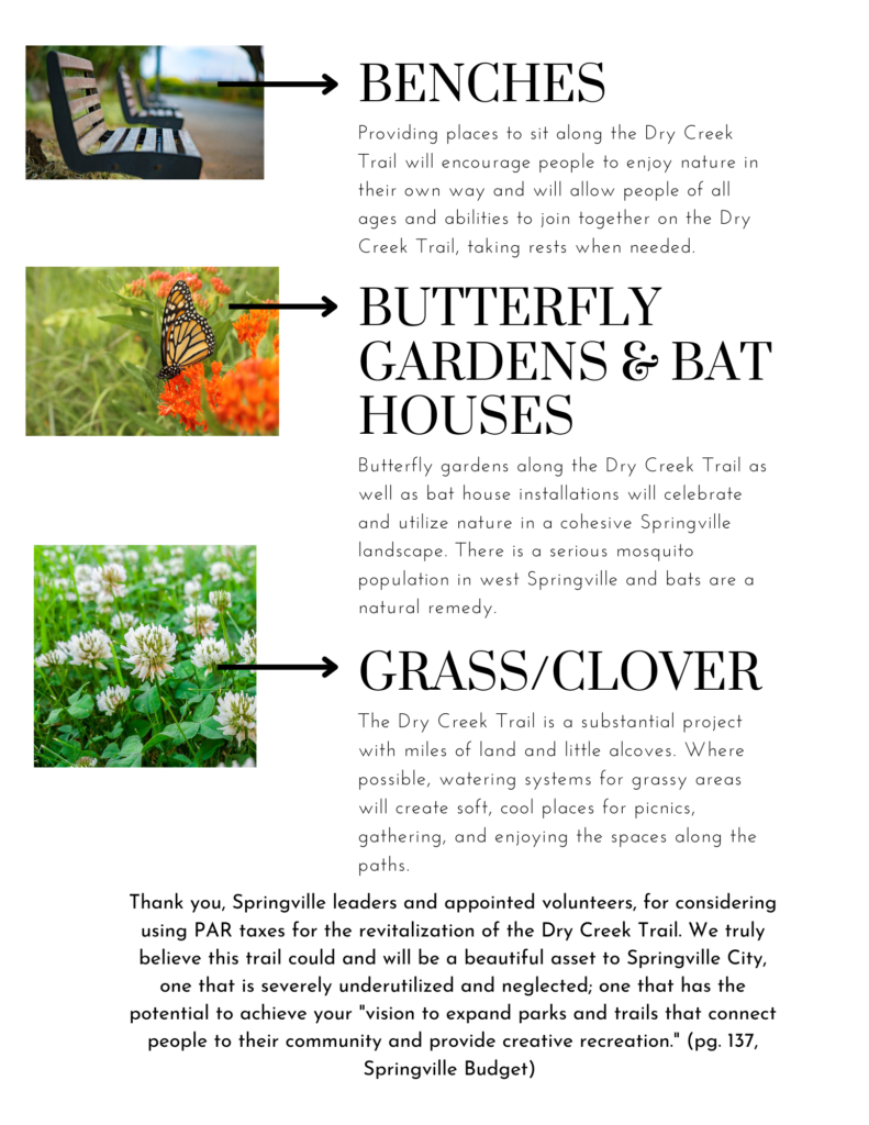 The Springville Parks, Arts, and Recreation Board recently voted to line item the Dry Creek Trail into next year’s budget (which begins on July 1, 2022). The sum allocated to the Dry Creek Trail is enough to hire a specialist to assess the land and create a plan. This is thrilling news! Many residents in the Dry Creek Area have been begging for attention on the Dry Creek Trail for over ten years and now the Dry Creek Trail is a priority for the city council! Hallelujah! The Dry Creek line item will be discussed in the council meeting on, I think, July 19th at 7:00 in the Civic Center.